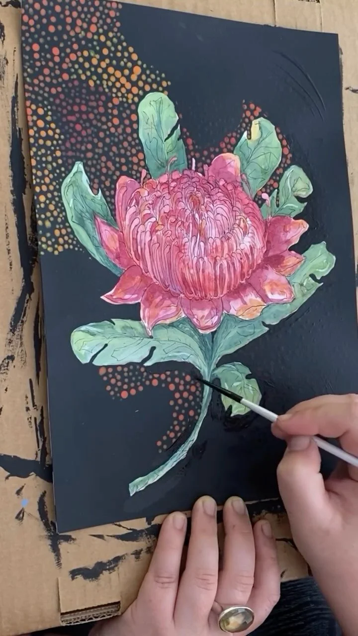 The pieces "‘The Watchers’ and ‘The Honeyeater’ were created for the ‘Emergence Exhibitions’ curated by Lily Power, a beautiful night for local Northern Beaches artists to showcase and sell their pieces whilst forming connections within the community.