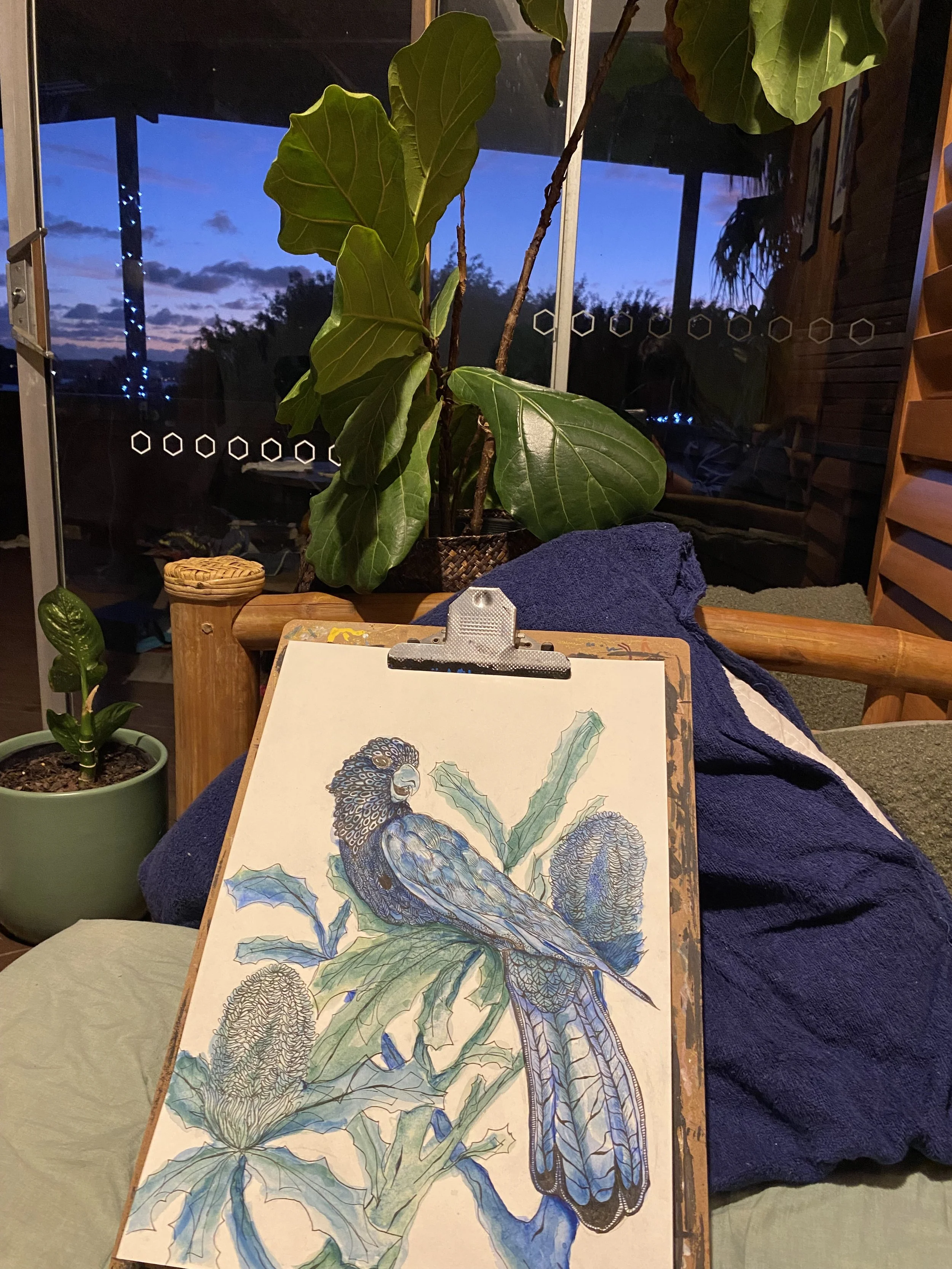 The A3 piece “Magpies in the Night” sold at exhibition and is a multimedia creation made using water colours, acrylic paint, ink pens and alcohol markers.